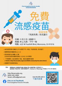 March 6, 2026 by « All Events This event has passed. 2020 Community Flu Shot Clinic October 3, 2020 @ 9:00 am - 1:00 pm Free « 【English】Women’s Tea 2020 Harvest Festival 2022: Carnival » Flu Vaccine Consent Form Add to calendar Google Calendar iCalendar Outlook 365 Outlook Live Details Date: October 3, 2020 Time: 9:00 am - 1:00 pm Cost: Free Event Categories: Church Events, English Events, 國語堂行事曆, 粵語堂行事曆 Event Tags:2020, Community Care, 社區服務日 Organizer First Evangelical Church, Arcadia Phone (626) 249-0090 Email fecarc.office@gmail.com View Organizer Website Venue First Evangelical Church, Arcadia 625 W. Foothill Blvd Monrovia, CA 91016 United States + Google Map Phone (626) 249-0090 View Venue Website